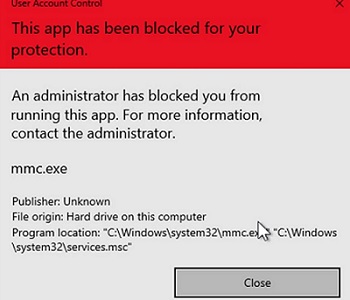 In some cases, Windows 10 may start blocking the launch of built-in Windows tool and programs. For example, mmc.exe program, through which run all Microsoft msc snap-ins (gpedit.msc, compmgmt.msc, services.msc, secpol.msc, devmgmt.msc, etc.).