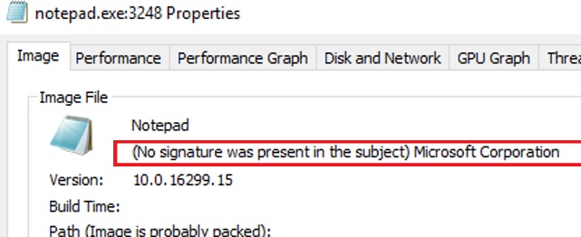 Try to run the Process Explorer and add the Verified Signer column. Most likely, in front of the applications, you will see the caption “No signature was present on the subject Microsoft Corporation”.