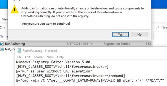 Windows Registry Editor Version 5.00 [HKEY_CLASSES_ROOT\*\shell\forcerunasinvoker] @="Run as user without UAC privilege elevation" [HKEY_CLASSES_ROOT\*\shell\forcerunasinvoker\command] @="cmd /min /C \"set __COMPAT_LAYER=RUNASINVOKER && start \"\" \"%1\"\""