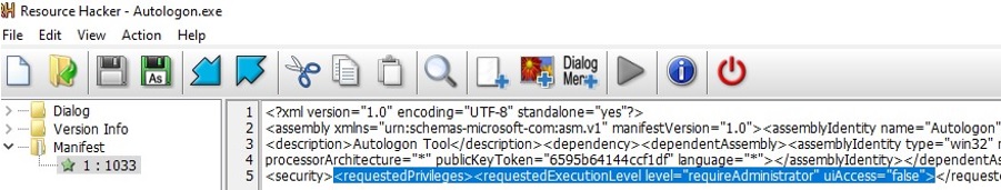 Autologon.exe tool by Sysinternals, which can be used to automatically log into Windows without a password. In the tree on the left, go to the Manifest section and open the program manifest. Pay attention to the following XML section: