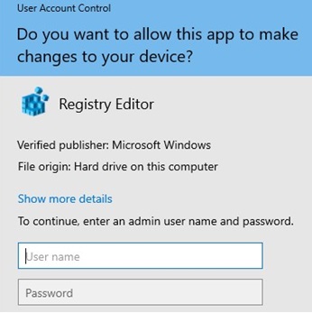 When you run regedit.exe, you will see a User Account Control prompt asking for the administrator credentials (Do you want to allow this app to make changes to your device?). If you do not provide a password and do not confirm elevation, the app won’t start.
