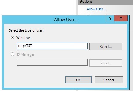 In the Actions panel, click on Allow User. Select the user account to which you want to grant access to IIS and click OK.