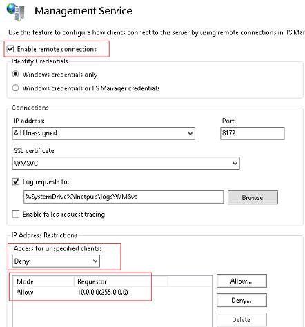 Here you can restrict connections to the IIS Management Console by IP address. To do it, deny connections for unspecified clients (Access for unspecified clients: Deny) and specify IP address/ IP subnets for which the connections are allowed. The remote connection service uses an SSL certificate, but you can use another one if you imported it into the server’s certificate store (you can create and use a self-signed SSL certificate using PoSh). Save the changes.