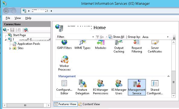 The next step is to allow remote connections in the IIS web server settings. To do it, open Management Service item in the Management section of IIS Manager.