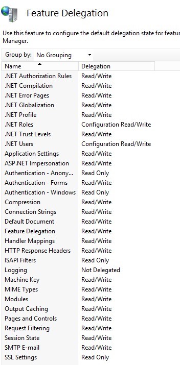 You can select one of three user access levels for each IIS server management functional: Read Only, Read/Write or Not Delegated.