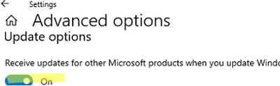 Check that the Receive updates for other Microsoft products when you update Windows option is now enabled under Settings -> Update and Security -> Windows Update -> Advanced options.