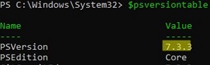 When the installation is complete, the PowerShell Core (pwsh.exe) window appears. Check the PowerShell version to ensure that it is updated to PoSh 7.3.3.